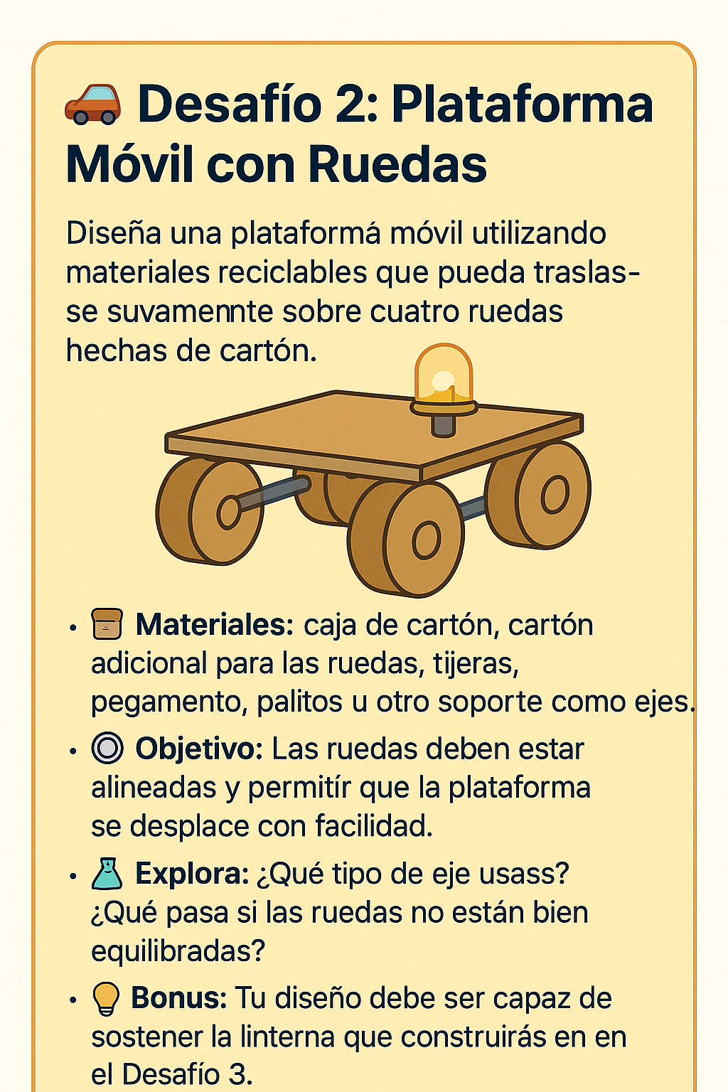 - 📦 Materiales: caja de cartón, cartón adicional para las ruedas, tijeras, pegamento, palitos u otro soporte como ejes.