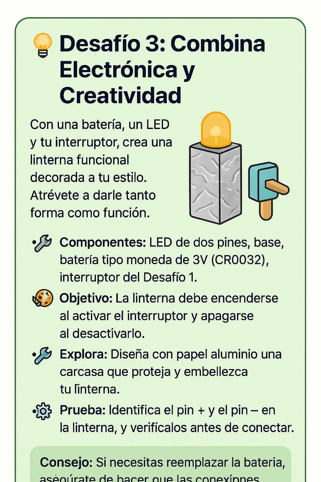 - 🧩 Materiales: LED, papel aluminio, batería de 3V tipo moneda, una base (cartón, madera liviana, etc.), interruptor.